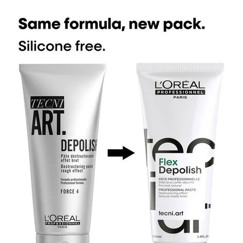 Flex Depolish 100ml is L’Oréal Professionnel’s destructuring and workable paste. The Tecni.ART must-have to deconstruct and mattify hair for a rough, unpolished look you can remodel. HAIRSTYLE: Rough effect, defined strands, matte and natural finish. HOW TO USE: Apply it on dry hair with hands for a disheveled matte finish. Work with fingers for definition and strands separation