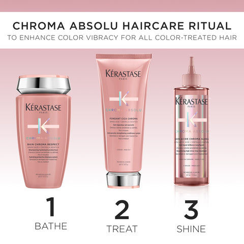 Step 1 - First, use the Bain Chroma Respect shampoo for coloured hair and towel dry hair. Step 2A - Massage Fondant Cica Chroma through mid-lengths and ends. Leave in for 2-3 minutes and rinse thoroughly. Step 2B - Apply Chroma Soin to mid-lengths and ends until saturated. Apply 1 dose if fine hair, or 2 doses for thick or long hair. Massage on the lengths for 1-2 minutes until the liquid texture transforms into a white cream. Step 3 - Rinse thoroughly.