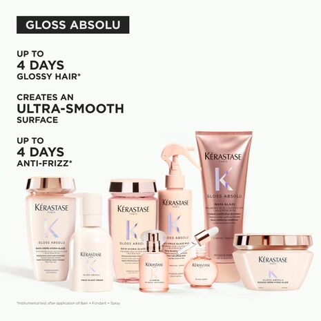 To maximise the results combine with the rest of the Gloss Absolu range. Start with the Crème Hydra-Glaze Shampoo for ultimate clean shine. Add the care with Crème Hydra-Glaze Mask. Finally, style with leave-in Kérastase Glaze Drops as the final gloss touch.